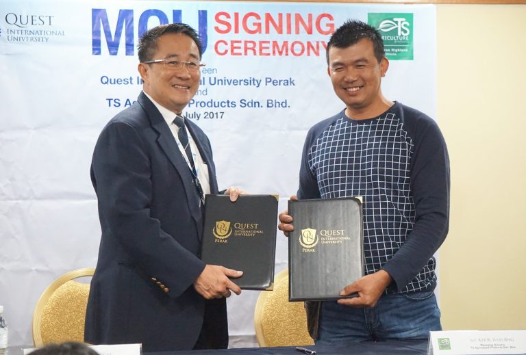 Quest International University Perak (QIUP) today inked a partnership MOU with TS Agriculture Products Sdn Bhd, one of the largest agriculture producer in Cameron Highlands, at a ceremony held at QIUP campus in Ipoh.