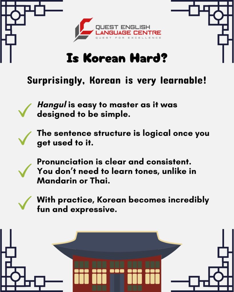 Korean is structured, logical, and very beginner-friendly, especially when you start with Hangul—its beautiful, phonetic alphabet that can be learned in just a few hours!