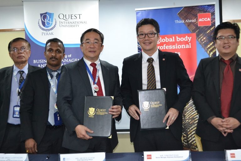 A Memorandum of Agreement (MoA) signed between Quest International University Perak (QIUP) and the Association of Chartered Certified Accountants (ACCA) Malaysia today will facilitate student support in their professional development and careers in accounting.