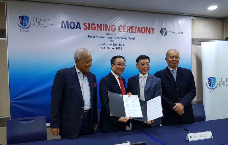 On hand to sign the MoA was QIU Chief Operating Officer (COO) Nicholas Goh and Cardzone Sdn Bhd Chief Executive Officer (CEO) Danny Lo. The signing was witnessed by QIU Council member Tan Sri Dato Seri Megat Najmuddin Datuk Seri Dr Hj Megat Khas, and Cardzone Executive Chairman Datuk Raymond Yeong.