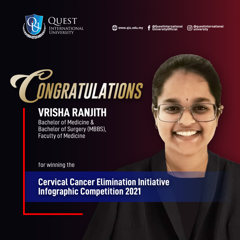 The Bachelor of Medicine & Bachelor of Surgery (MBBS) Batch 14 student won first place in a Cervical Cancer Elimination Initiative Infographic Competition 2021, organised by Taylor’s University’s School of Medicine.