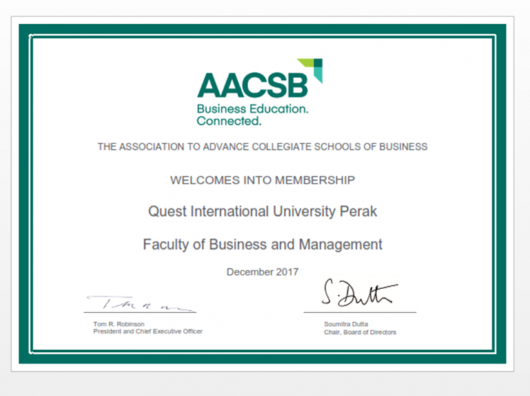 The Faculty of Business and Management (FBM) at Quest International University Perak (QIUP) has been accepted as a member of the Association to Advance Collegiate Schools of Business (AACSB). From 1916, the AACSB accreditation has grown to be known as a global recognition of the highest standards of excellence across business schools. Current AACSB accredited business schools include Harvard University, Yale University, and Warwick Business School. Being part of such distinguished company sets the stage for FBM and QIUP to collaborate with member organisations, to pursue novel business education ideas as well as to closely align with the needs of business practice. Pursuing the accreditation signifies our commitment to our stakeholders and facilitates our aspiration to contribute positively to the communities we engage with.