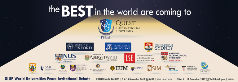 Quest International University Perak (QIUP) welcomes the global debating community to the QIUP World Universities Peace Invitational Debate (also known as QIUP WUPID 2017), as they arrive to Ipoh from December 08 to December 12, 2017.