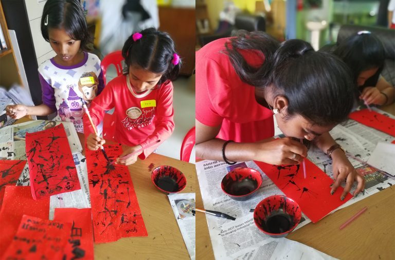 QIUP volunteers mingled with the children through designing lion dance costumes using recycled boxes and clothes. The children then proceeded to perform a lion dance using the materials they made. Other activities included making Chinese New Year crafts such as paper cutting, ink painting and fish making. There was also a sing and dance along session to the beat of Chinese New Year songs by both the children and volunteers.